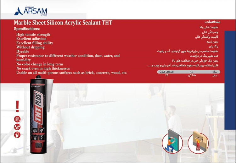چسب ماربل شیت THTماستیک اکریلیک سیلیکونیزه یک نوع درزگیر و چسب ساختمانی است که ترکیبی از ویژگی های اکریلیک و چسب سیلیکون را دارد. این محصول بافتی خمیری دارد و بعد از خشک شدن، سطحی انعطاف پذیر، مقاوم و بدون ترک ایجاد می کند. وجود سیلیکون در فرمول آن باعث افزایش چسبندگی، ماندگاری و مقاومت در برابر رطوبت می شود.