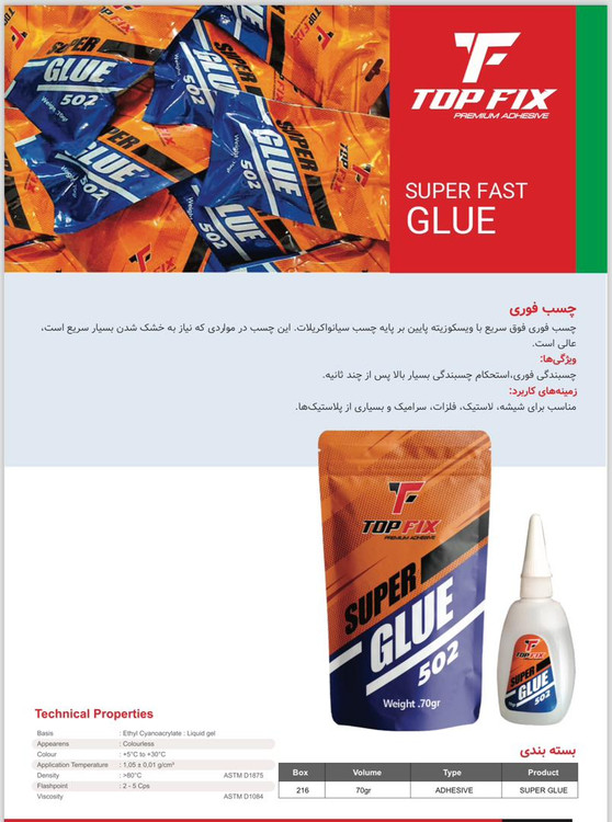 سب قطرهای ساندیسی 502 تاپ فیکس ، که وزن 70 گرم دارد، یک نوع چسب قطرهای است که برای چسباندن سریع و قوی انواع اجسام خانگی و صنعتی از جمله مواد پلاستیکی، چوبی، پی وی سی و غیره مناسب است. این چسب یک گستره کاربردی بسیار وسیع دارد. چسب قطرهای ساندیسی، که با نام تجاری چسب بنر هم شناخته میشود، یک نوع چسب قطرهای با سرعت و قدرت چسبندگی بالا است. این چسب از خانواده سیانواکریلاتها است و در عرض چند ثانیه باعث چسبندگی با کیفیت روی بسیاری از سطوح میشود.