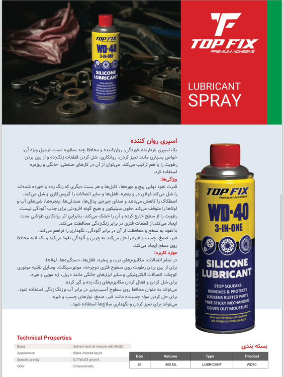 این محصول یک اسپری چند کاره است که جهت روانکاری ، تمیز کردن ، و روان کاری ، براق کردن ، از بین بردن زنگ زدگی و حتی محافظت فلزات در برابر رطوبت از آن در دنیا استفاده می گردد . این محصولی ویژه با کاربری های فروان در خانه ، محل کار ، کارگاه ، کارخانه مورد استفاده قرار می گیرد .